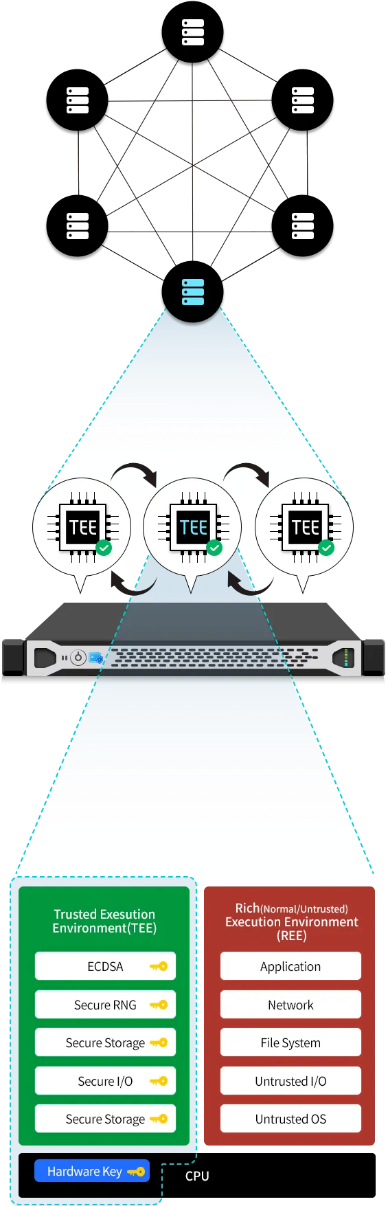 TEE는 CPU에서 제공하는 가장 강력한 보안기능중 하나입니다. CPU는 TEE와 REE 두 가지 환경을 완벽하게 격리합니다. REE는 사용자가 컴퓨터를 사용하면서 이메일도 보고 웹서핑도 하고 워드 작업도 하는 일반적인 환경입니다. 따라서 REE는 피싱 공격이나 drive-by-download 등을 통한 컴퓨터 해킹 등 다양한 위협에 노출될 수도 있습니다. 하지만 해커가 운영체제까지 장악하더라도 TEE에서 보호되는 데이터에는 접근이 절대 불가능합니다. 이것이 가능한 이유는 바로 CPU마다 고유한 Hardware Key가 CPU 회로 안에 존재하기 때문입니다. TEE에서 사용되는 데이터는 Hardware Key로 암호화되어있기 때문에 Hardware Key에 접근이 불가능한 REE에서는 암호화된 데이터의 복호화가 불가능합니다. Hardware Key를 해커가 알아내기 위해서는 해커가 CPU를 물리적으로 탈취한 이후에 CPU의 회로를 전자현미경으로 한땀한땀 분석하는 고된 작업이 필요하므로 현실적인 공격 시나리오라고 보기 어렵습니다. 이렇게 하드웨어에서 회로적으로 구현된 안전한 키를 통해 TEE 환경을 안전하게 보호할 수 있습니다.